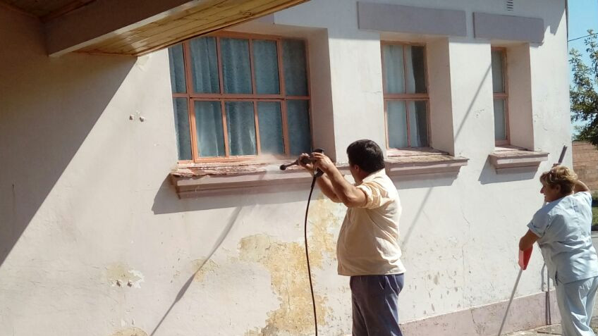 Se realizan tareas de hidrolavado en las paredes exteriores del Hospital Municipal Dr. Raúl Montalverne, por la calle Tucumán.
